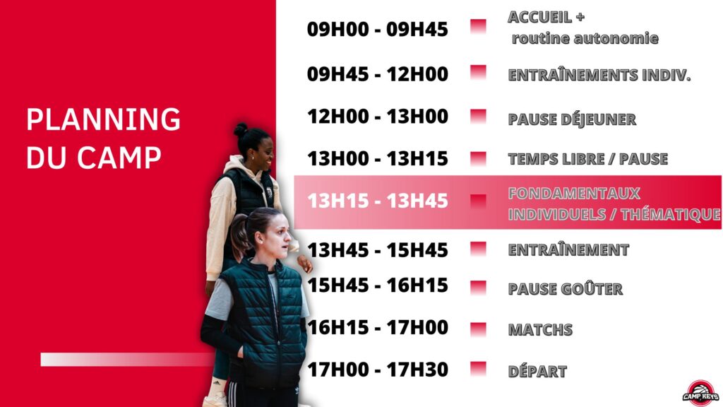 Un format unique qui plonge les joueurs dans une approche scientifique et experte des fondamentaux du basketball. Chaque camp devient une véritable “School” thématique : École du Shoot, École du Handle, École des Point Guard, École du Post Up… L’objectif : décortiquer en profondeur chaque geste et chaque décision pour construire des bases solides et maîtriser son poste avec précision.