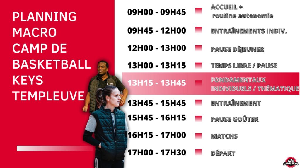 Un concept innovant où deux thématiques complémentaires sont explorées par deux coachs en alternance. Les joueurs découvrent différentes visions du jeu et construisent une compréhension plus complète et moderne du basketball.